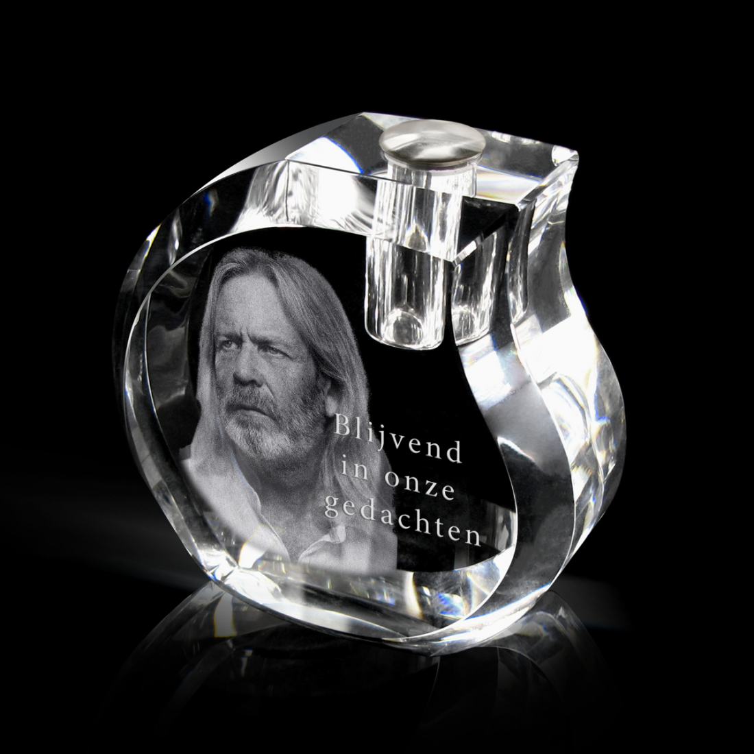 Foto's, tekst en vingerafdrukken kunnen 2D of 3D in het glas worden gelasergraveerd. De mogelijkheden zijn eindeloos, neem gerust contact op als u specifieke wensen heeft.