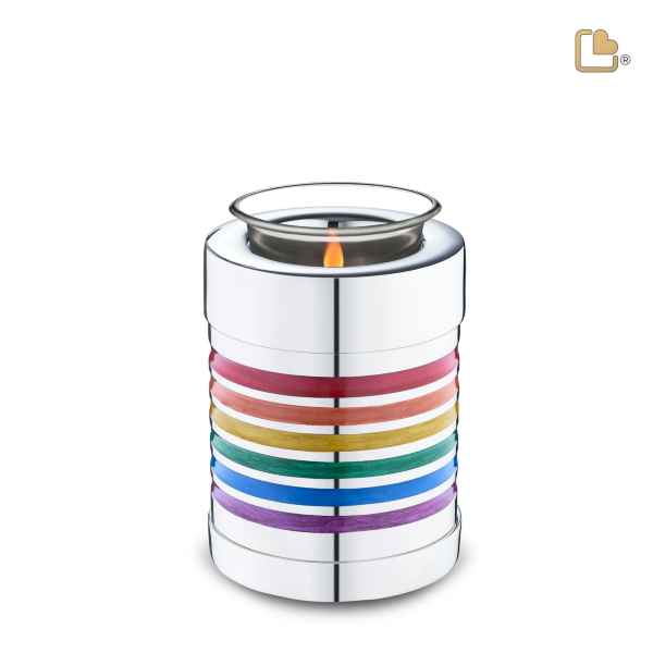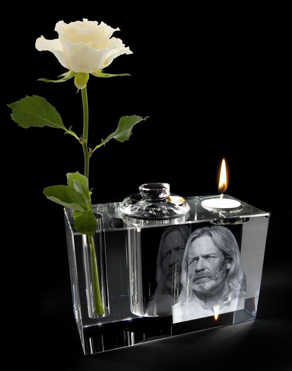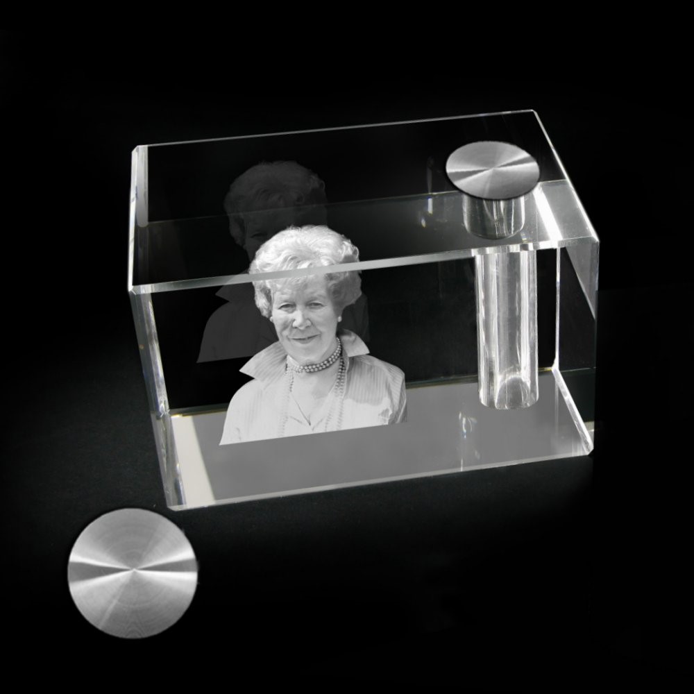 Gedenkglas | glazen blok met 3D foto, as, waxine en mini-vaasje